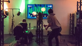 This game was developed by a team of four students as a project at the HAW Hamburg and is designed for an installation using pressure pads. The original setup uses three traverses on the sides of which pressure pads are attached. Each player has one pressure pad to their right, one to the left and one on a low table to the front. For controlling the characters on the big screen in front of the players, they use plastic pickaxes to hit the respective pressure pads (left, right, and the one in the front for downward movement).